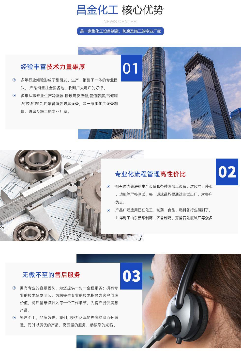 淄博昌金化工设备有限公司专业生产铝储罐,衬胶设备,衬塑设备,冷凝器,搪玻璃反应釜,管道防腐,四氟管道等防腐设备,是一家集化工设备制造、防腐及施工的专业厂家。      本公司(原淄博昌金防腐设备有限公司)位于淄博市张店区南定镇漫泗河村,年生产各种碳钢、不锈钢、化工设备近千吨,公司2005年投产搪玻璃反应釜、搪玻璃反应罐行业,在搪玻璃反应釜、搪玻璃反应罐行业中获得了广大客户的一致好评,现有职工70余人,其中各类专业工程技术人员20余人。下设化工制造车间、防腐车间以及设备工程安装车间。公司宗旨:质量为本,用户至上,信誉为本,敢于创新。